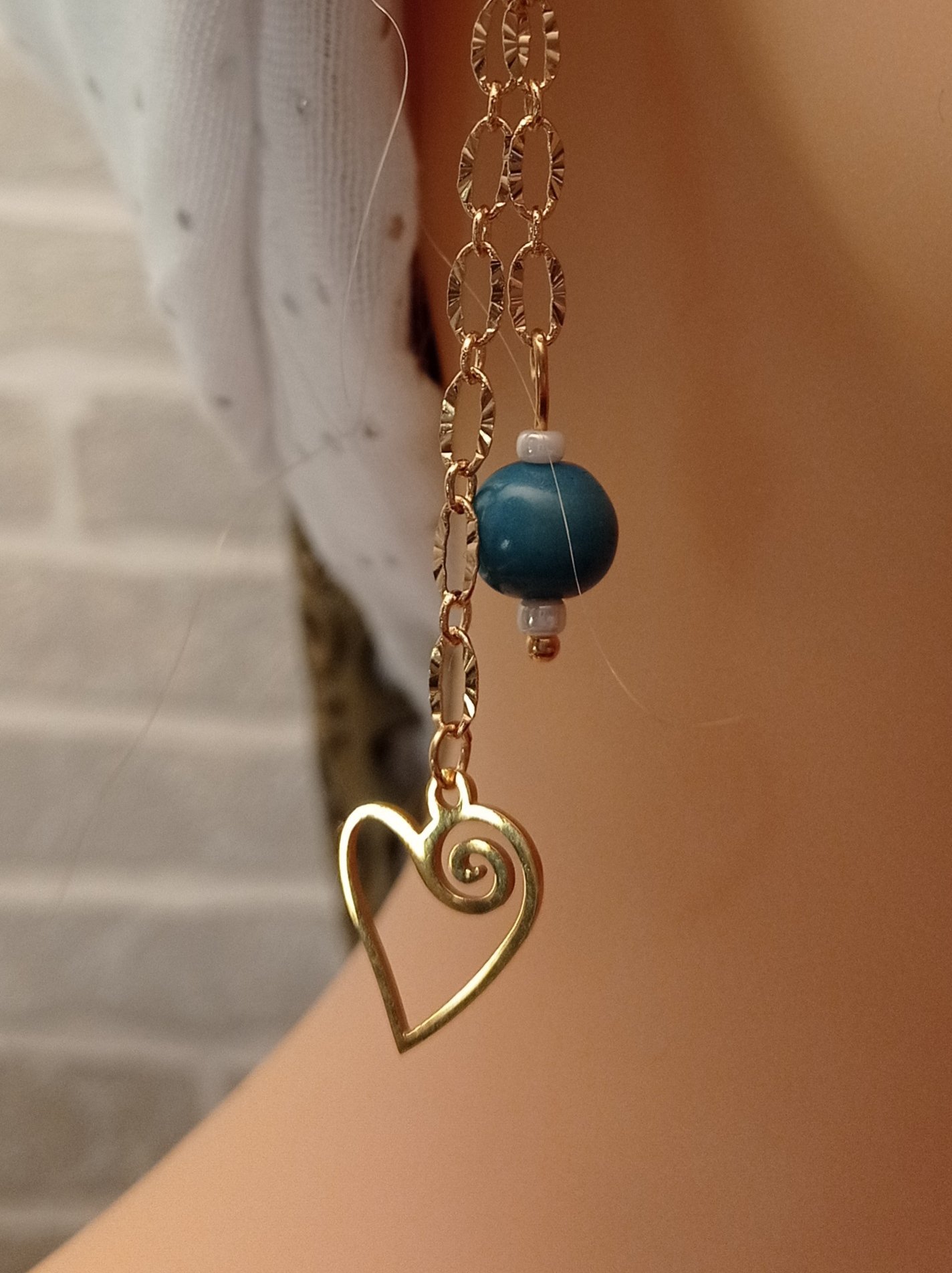 Boucles d'oreilles chaîne en laiton doré, cœur et crochet en acier inoxydable doré, perle en graine açaî du Brésil bleue.