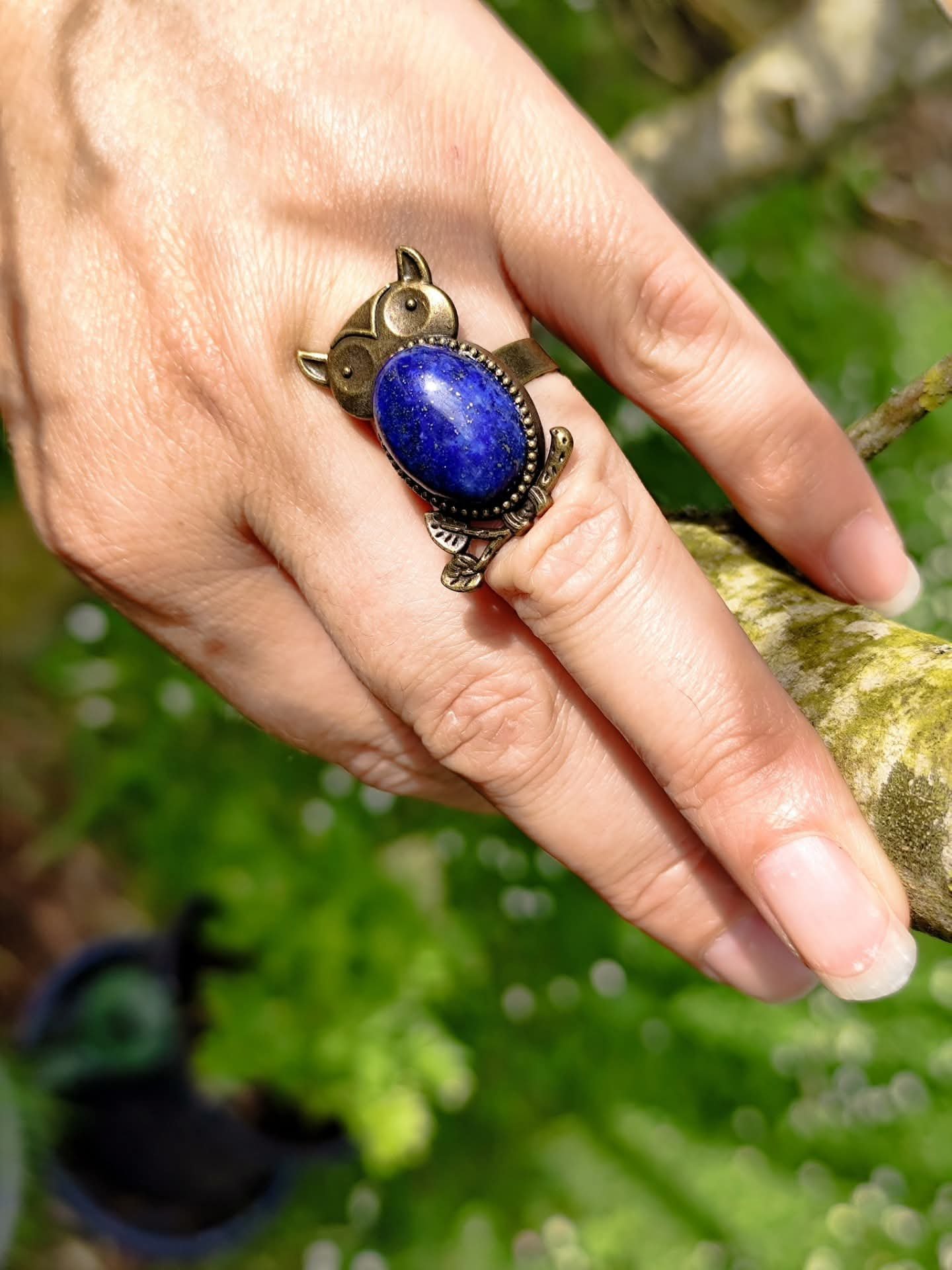 bague hibou réglable en métal bronze surmontée d’un cabochon en lapos lazuli