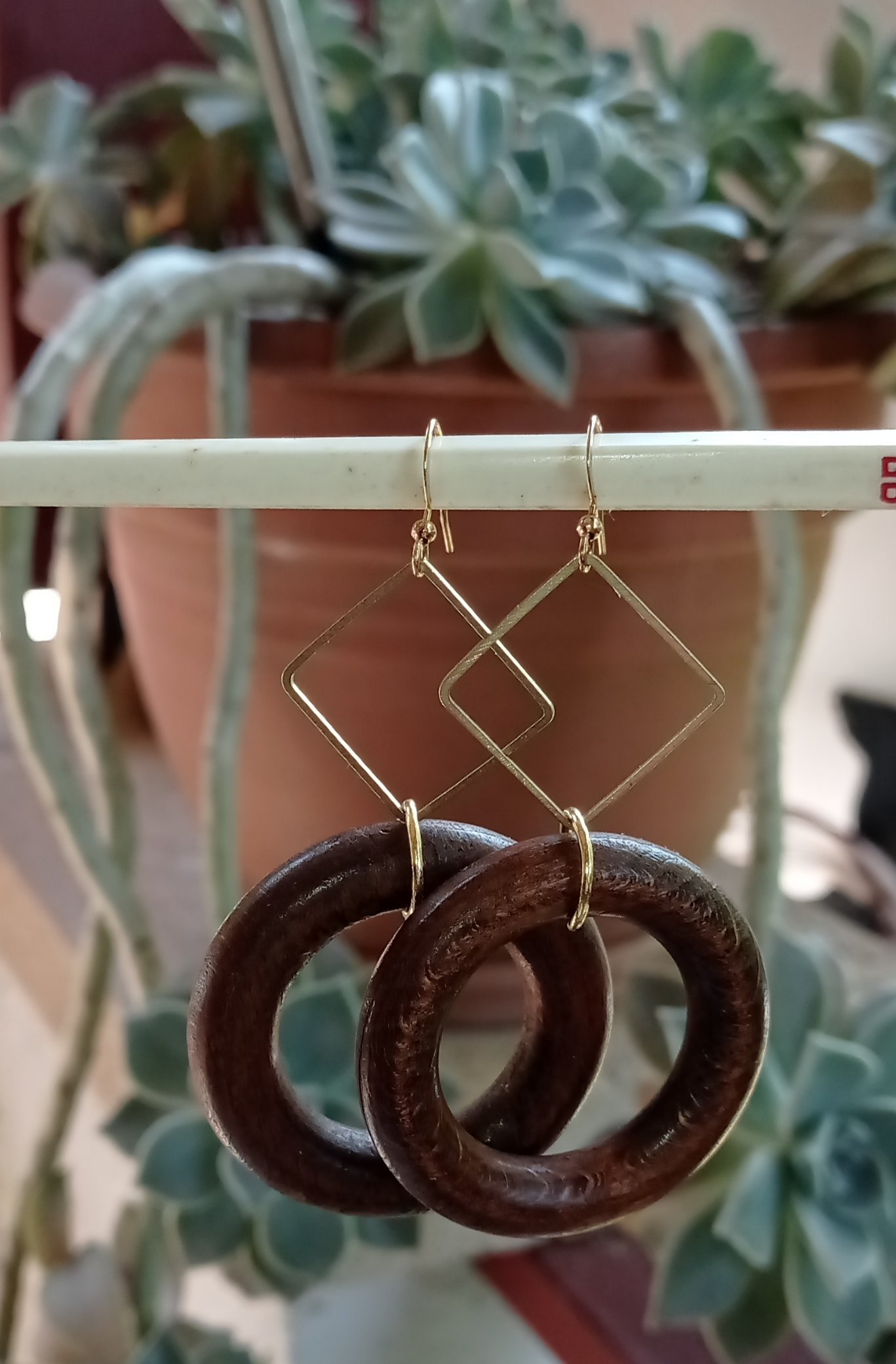 Boucles composées d'un carré en laiton aspect vieilli,un anneau en bois foncé.crochet d'oreilles en laiton doré
