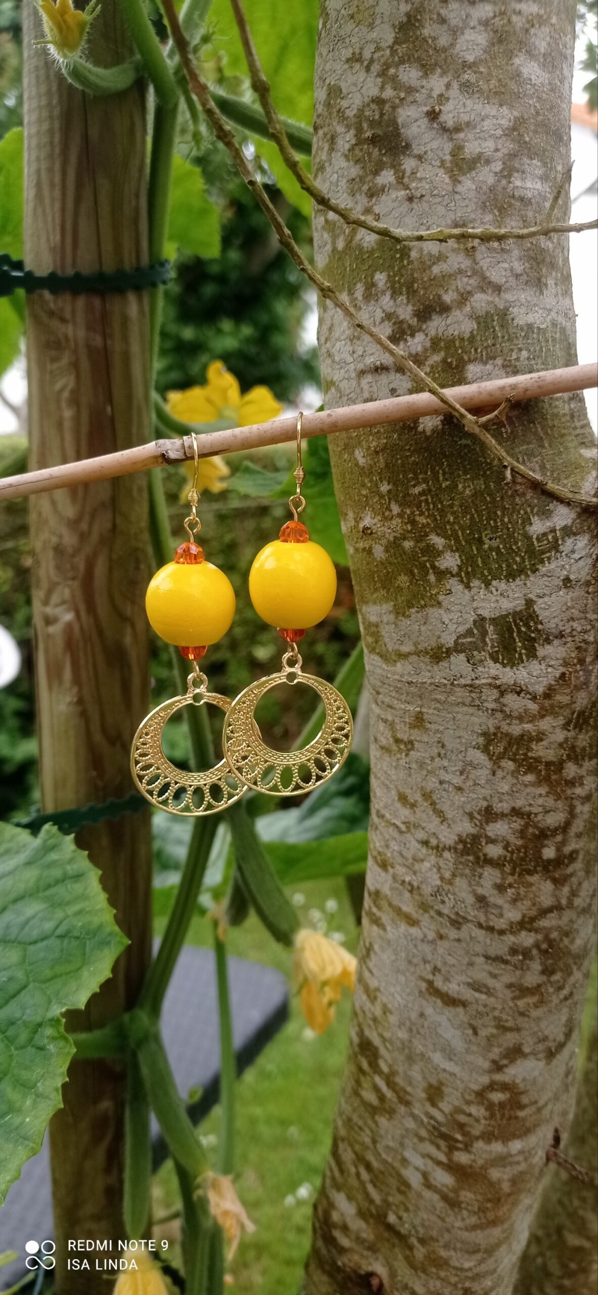 Boucles d'oreilles crochet en acier inoxydable, grosse perle en bois peinte,petites perles en verre et pendentif en laiton doré.