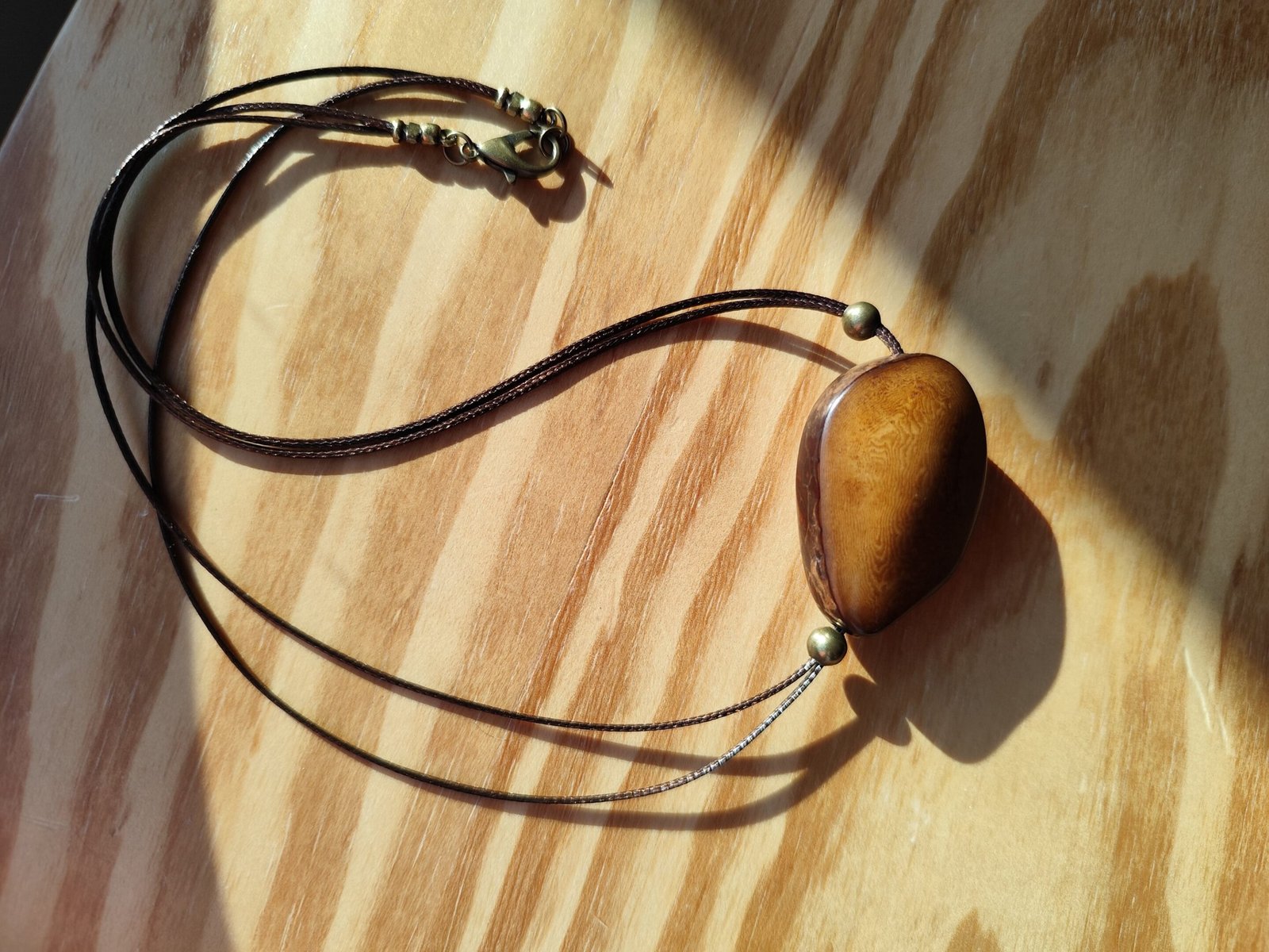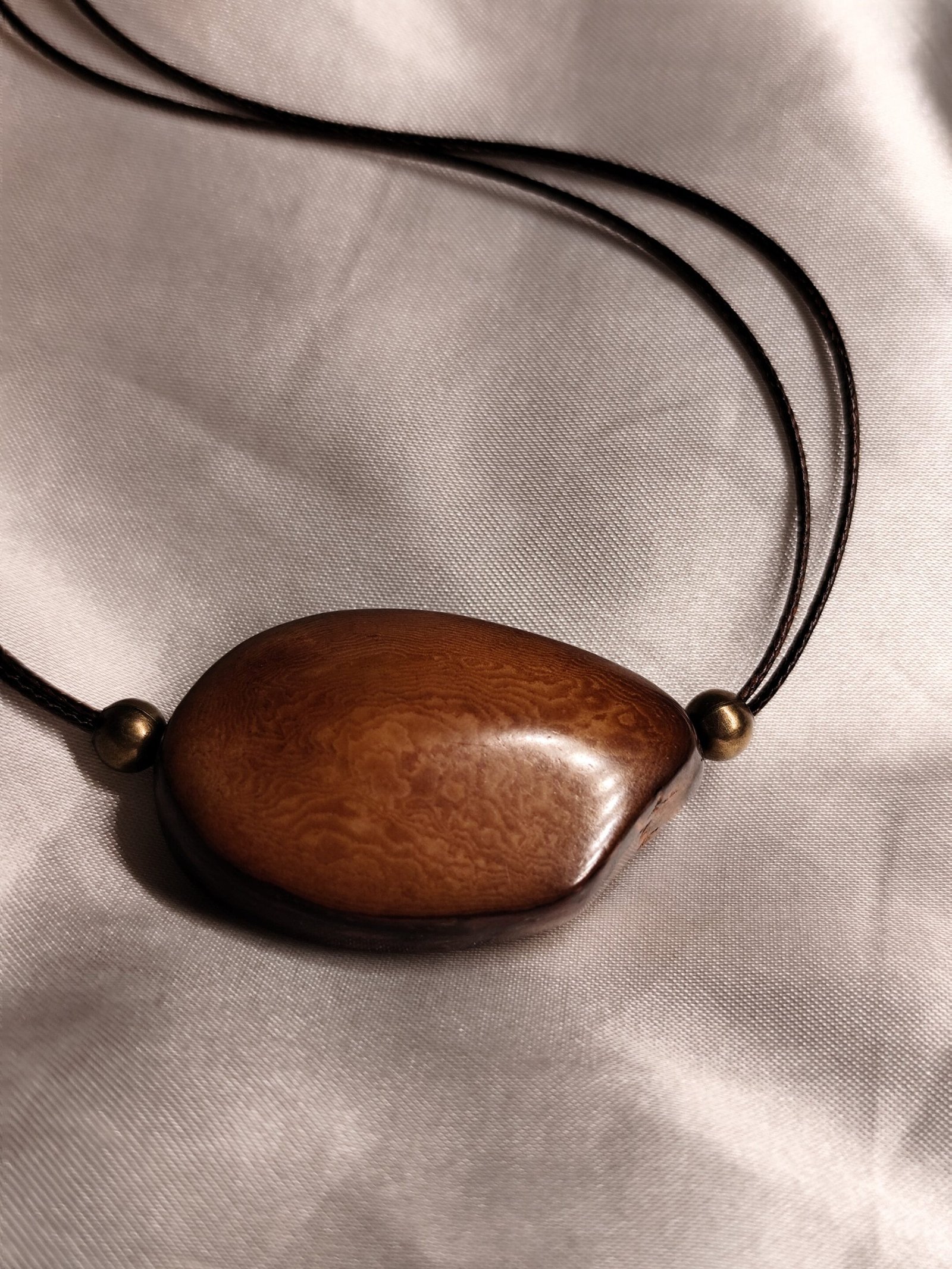 collier cordon en polyester cirée marron foncé, perle couleur bronze en laiton et pendentif en graine de tagua (ivoire végétale).