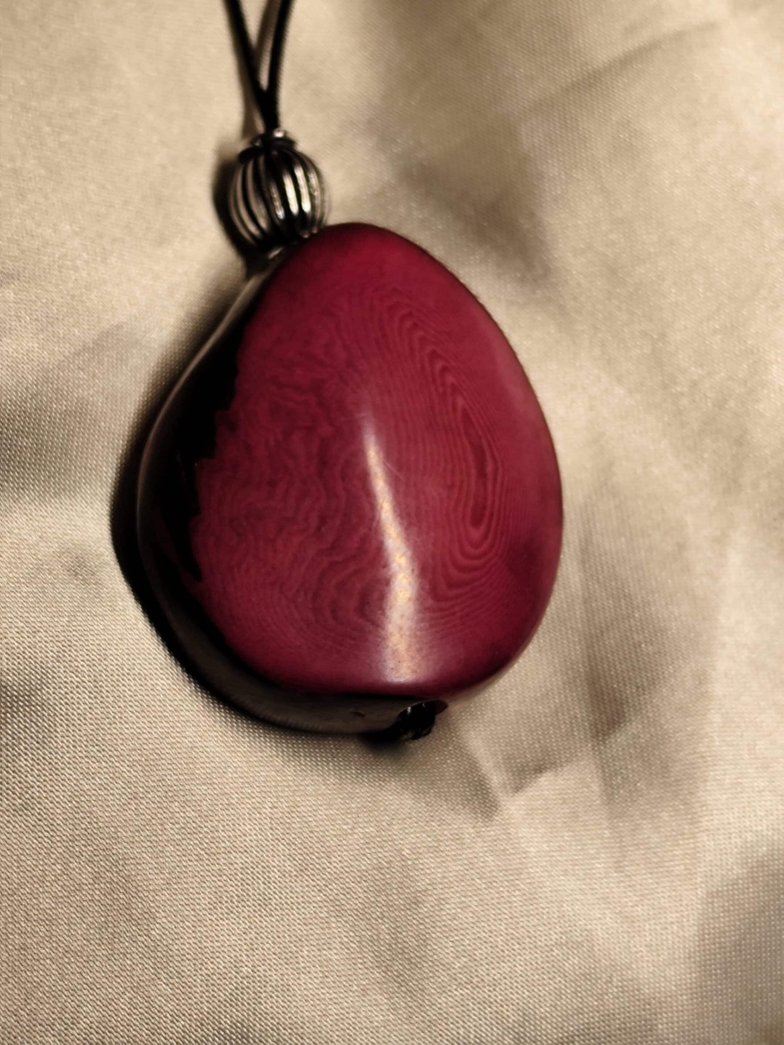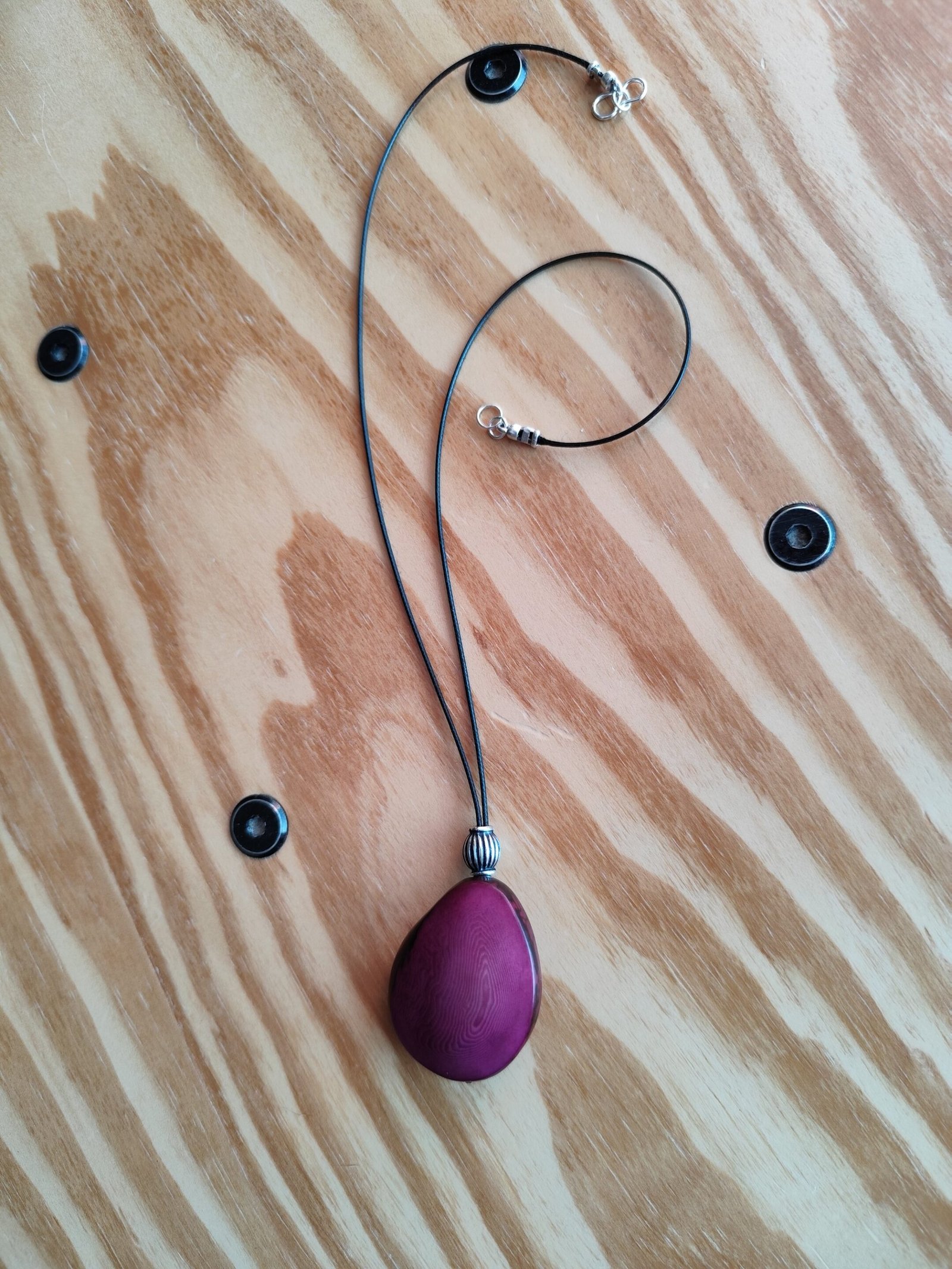collier cordon en polyester cirée noir, pendentif graine de tagua (ivoire végétal), perles zamac argenté vieilli.Fermoir acier inoxydable argenté.
