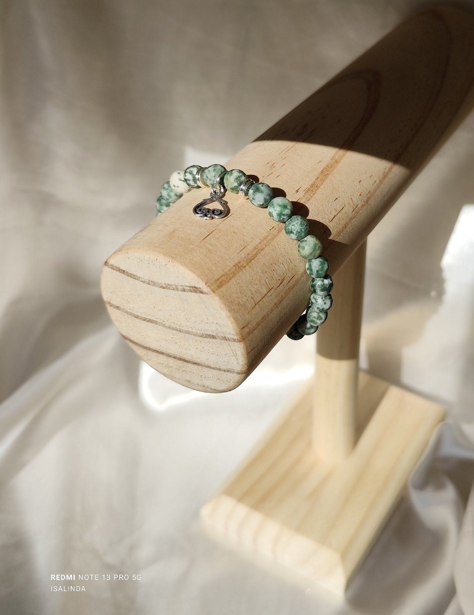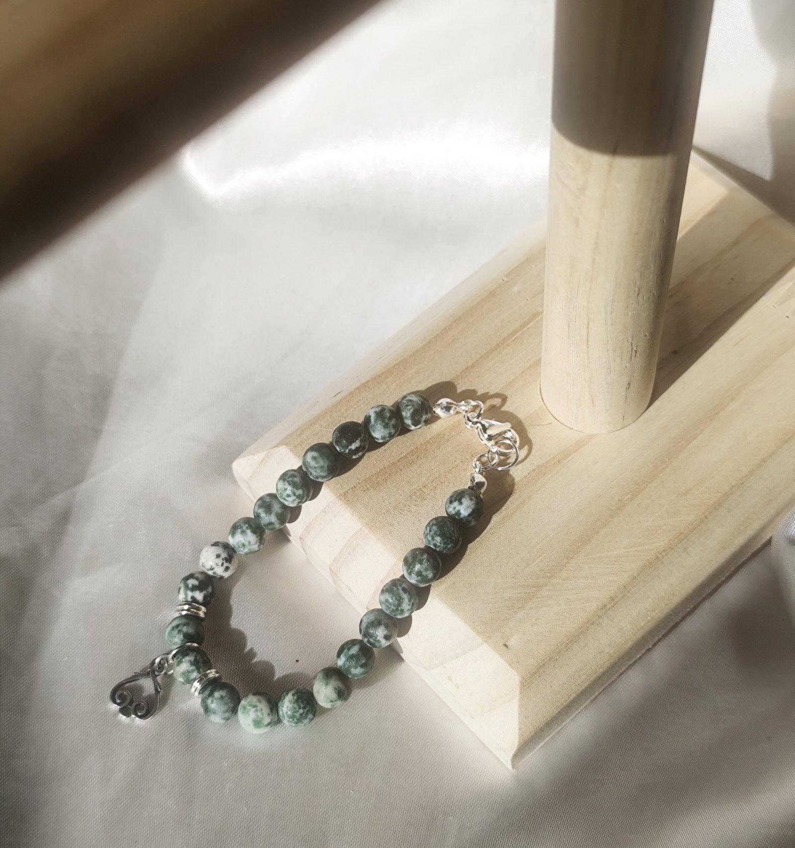 bracelet élastique avec fermoir, breloque un acier inoxydable couleur argent vieilli et perle en jaspe givrée.