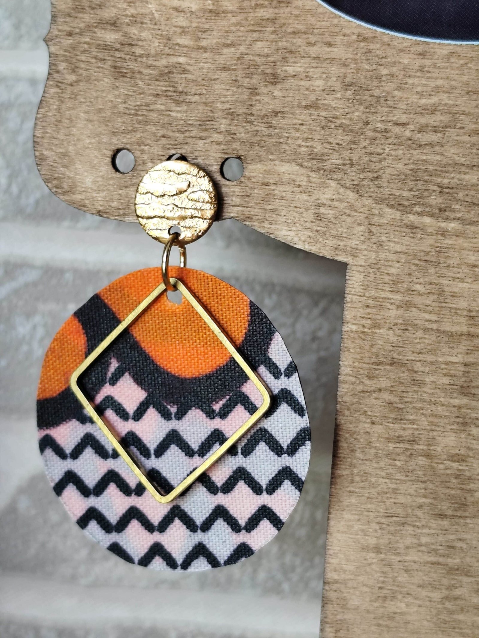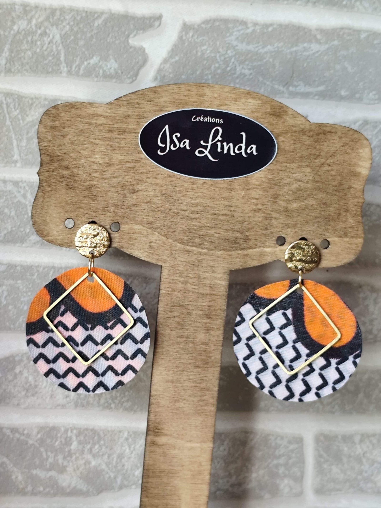 boucles d’oreilles créées à partir de chutes  »perdues » de wax véritable, clou d’oreille en acier inoxydable doré et pendentif carré en laiton.