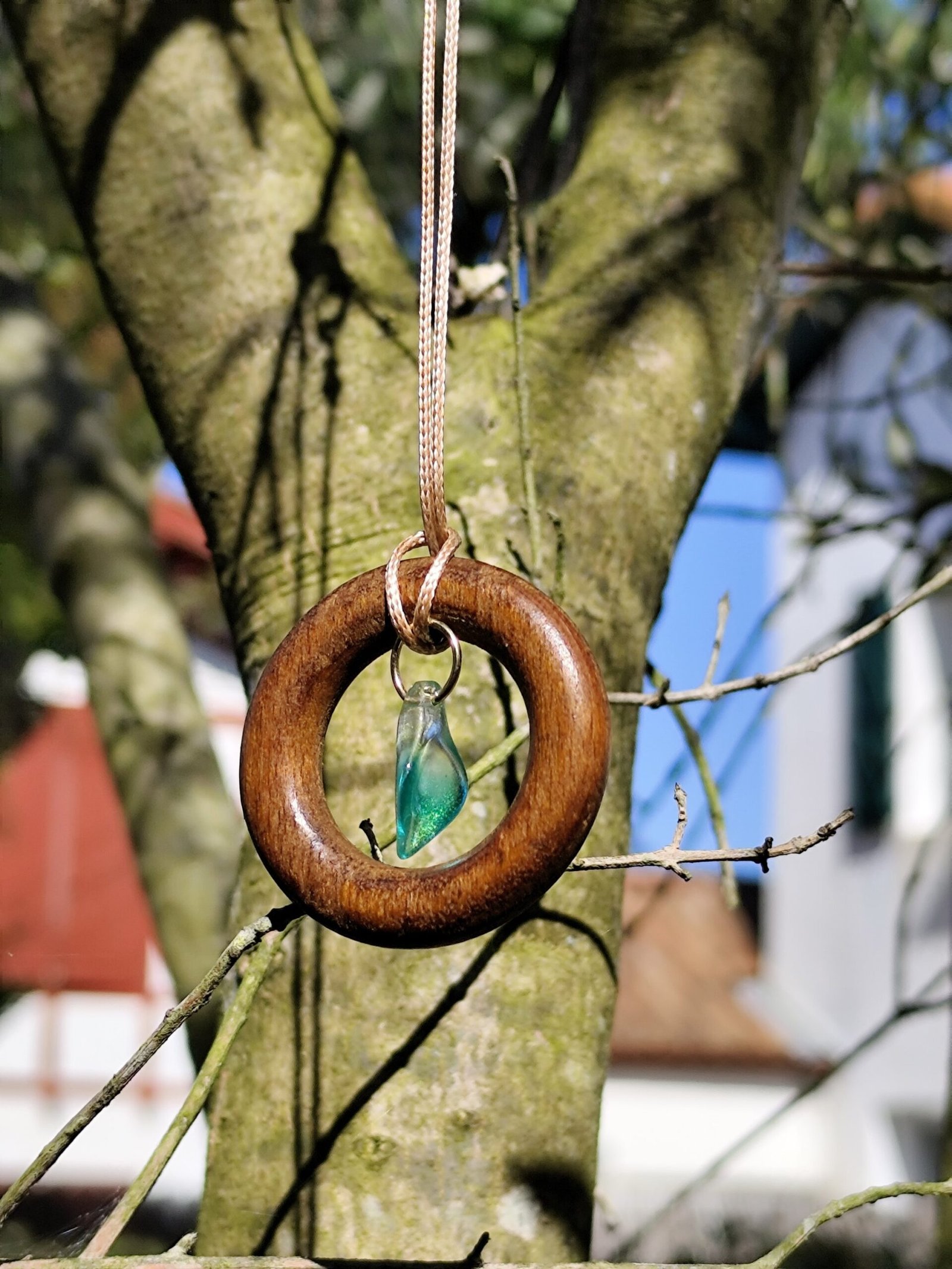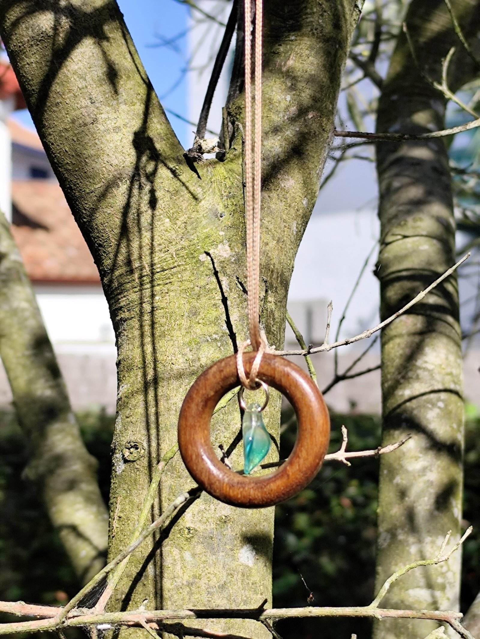 collier cordon en polyester ciré, pendentif à nous en bois avec une perle en verre.