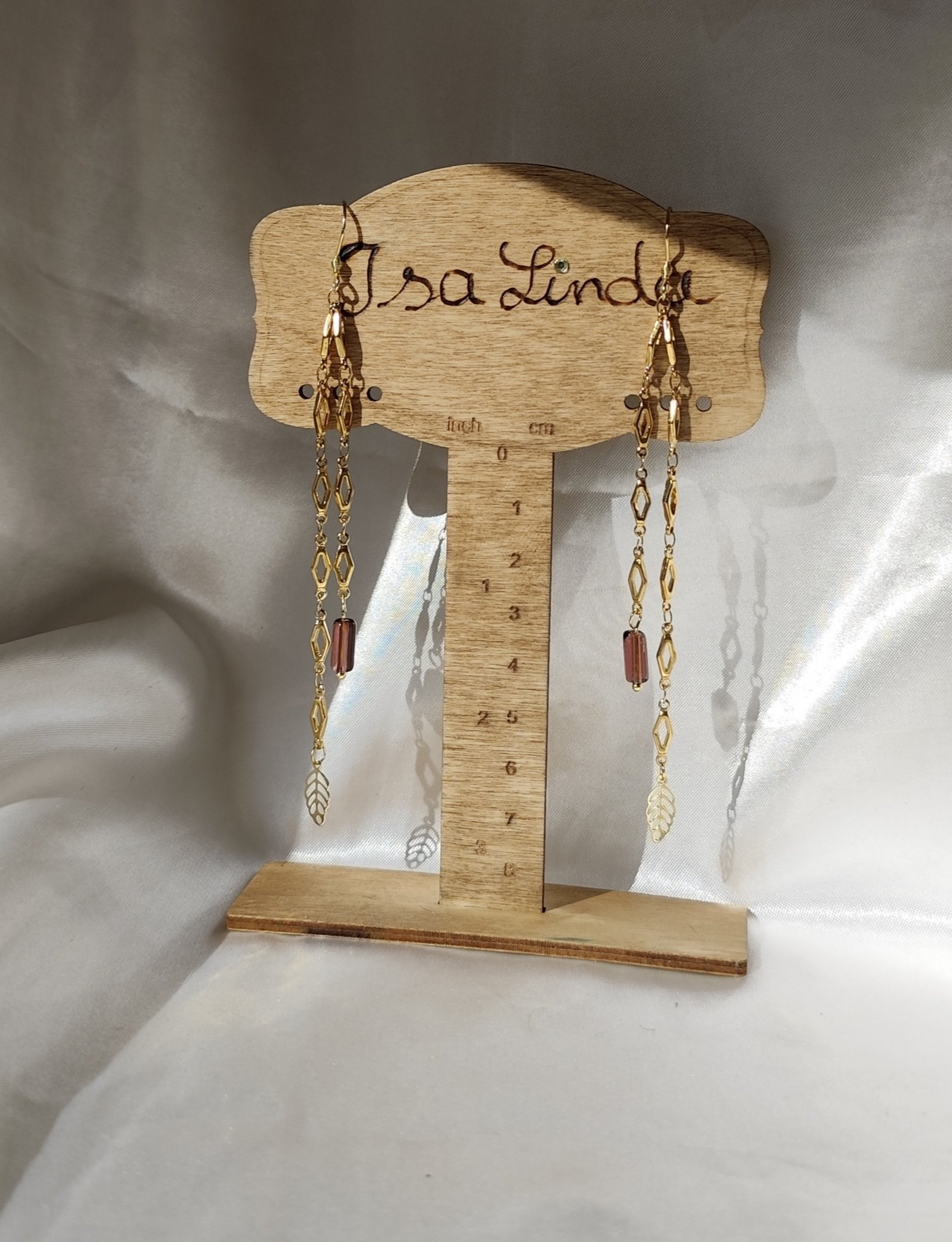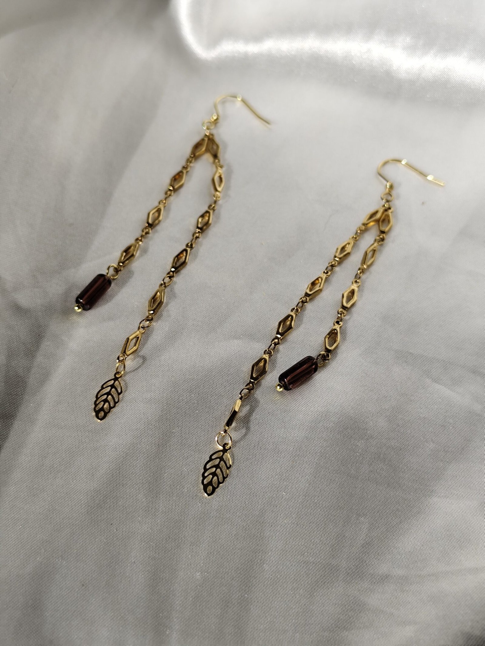 boucles d’oreilles chaîne et pendentif feuille, en acier inoxydable doré. perle tube en verre.