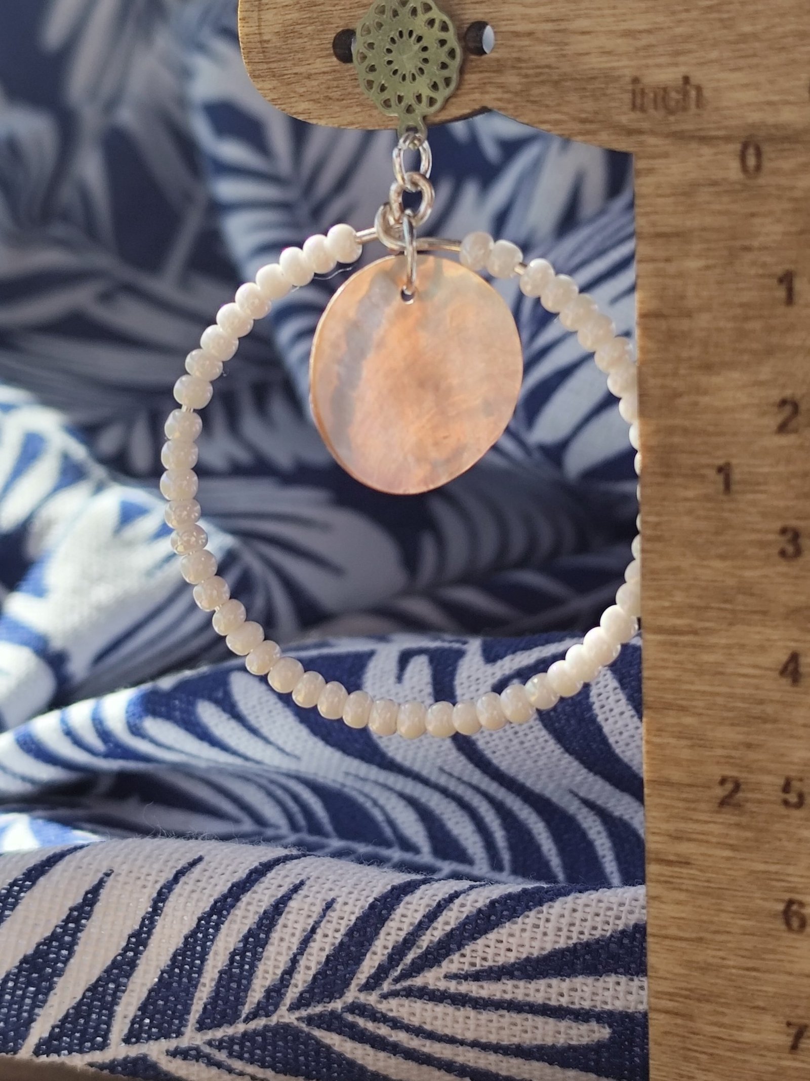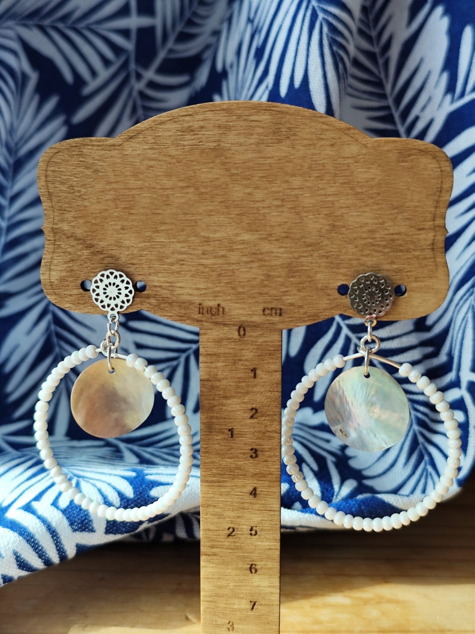 boucles d’oreilles en acier inoxydable,perles miyuki blanches et disques en coquillage nacré.
