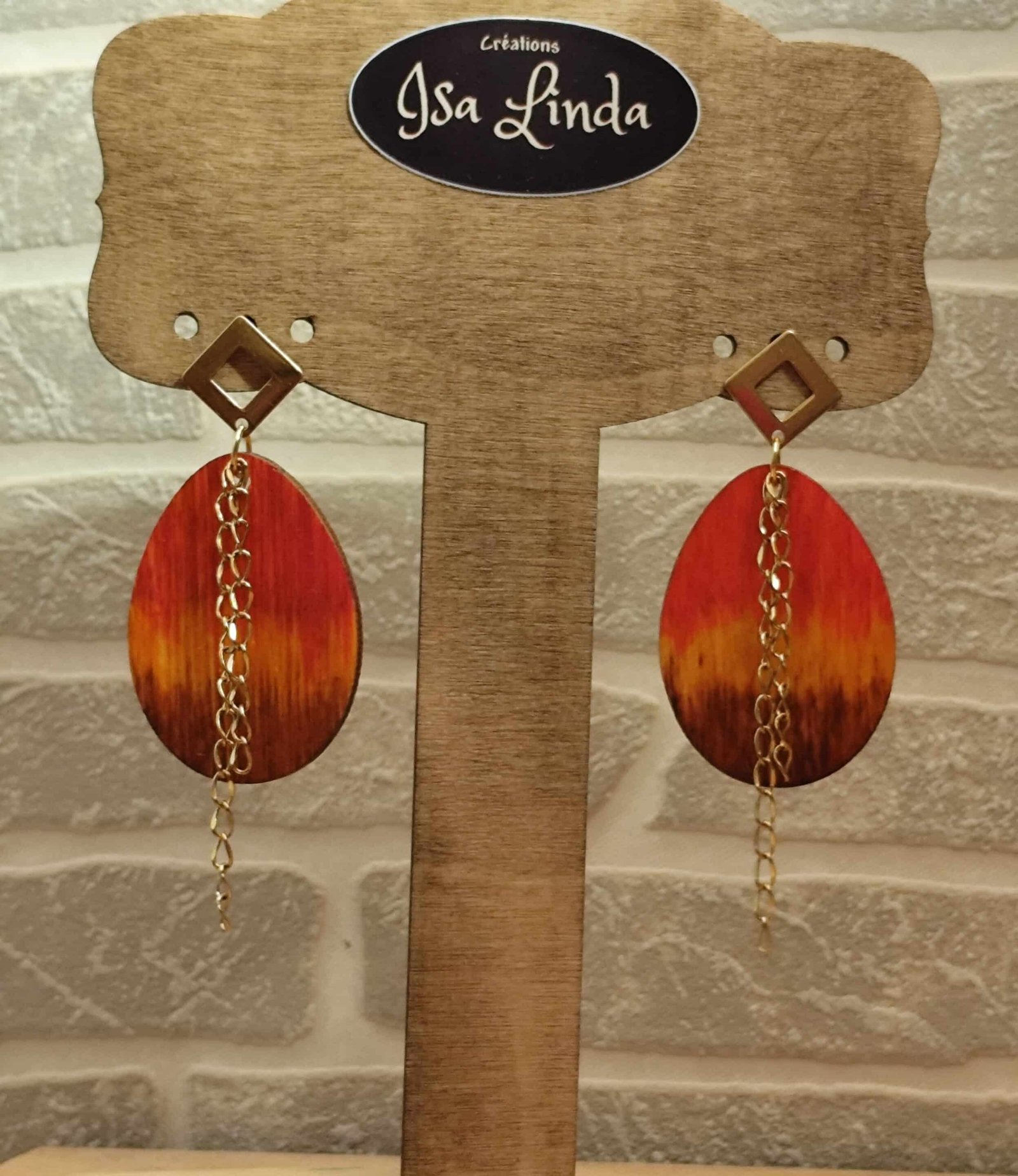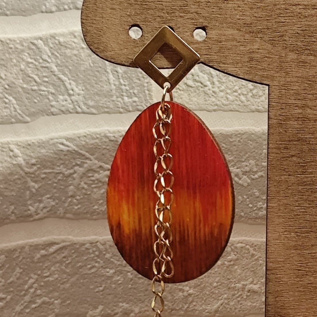 boucles d’oreilles en bois coloré à l’encre d’alcool, clou d’oreille et chaîne en acier inoxydable doré.