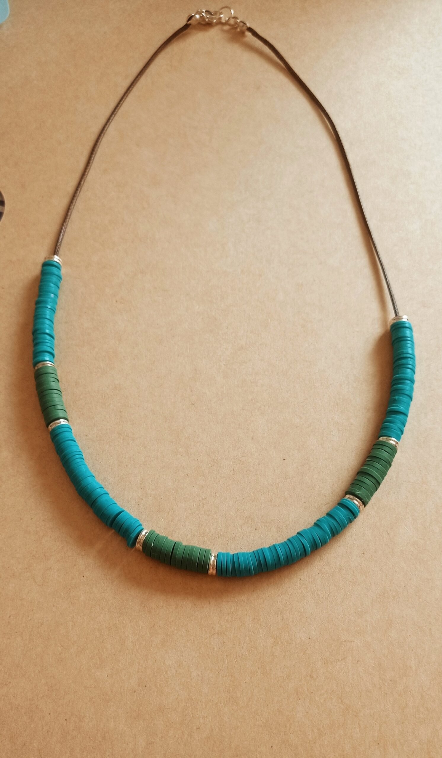 Collier cordon en polyester ciré marron, perles style heishi en pâte polymère et perles en laiton argenté.
